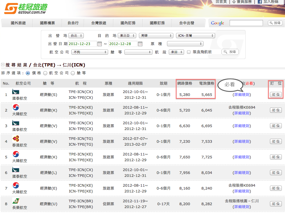 選好出發、回程日期、機場之後就可以進入搜尋囉,我都是依照價格排序。網路價格和電話詢問價格都有些差異,大家可以參考看看。