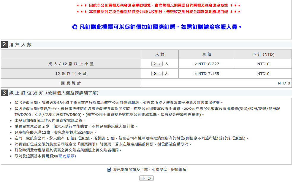 開始訂位之後就有總金額可以參考,也有注意事項可以再看一次,選完人數後確認OK就可以進入下一步囉:)