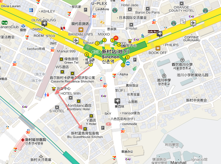 從新村站七號出口出來後就直走,網路上說是警察局前面巷口左轉,但地圖上的治安中心好像已經換位子了,從沒有看到他開門過...簡單來說就是第一個紅綠燈吧!對面是個非常小的巷子,也是個驚人的斜坡,拖著行李爬真的很辛苦啊~